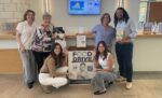 Jewish Philanthropies of Southern Arizona Community staff with a Project Isaiah donation box. Standing, from left: Impact and Engagement Coordinator Randi Levin, Director of Impact and Engagement Robyn Schwager, Director of Public Affairs Carina Bien-Willner, and Jewish Community Relations Council Associate Antar Davidson; kneeling, Senior Community Shlicha Yuval Malka and Junior Commuity Shlicha Daniella Ironi. (Photo courtesy JPSA)