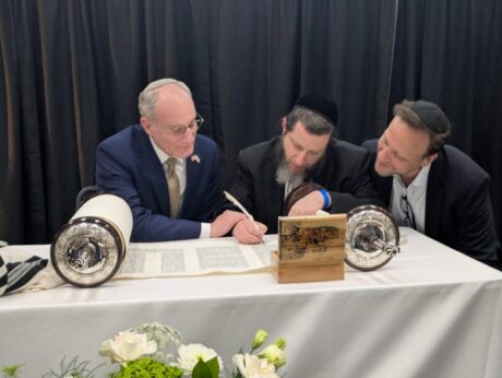Following the speech, Berkowitz and Amb. Leiter completed the final letters of the Torah with a scribe from Chicago, Rabbi Tzvi Bider, as the audience watched, enrapt.